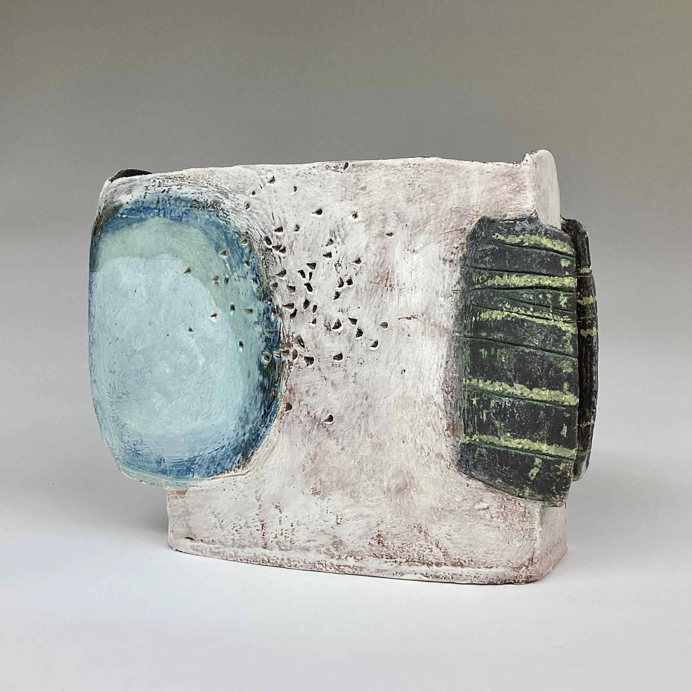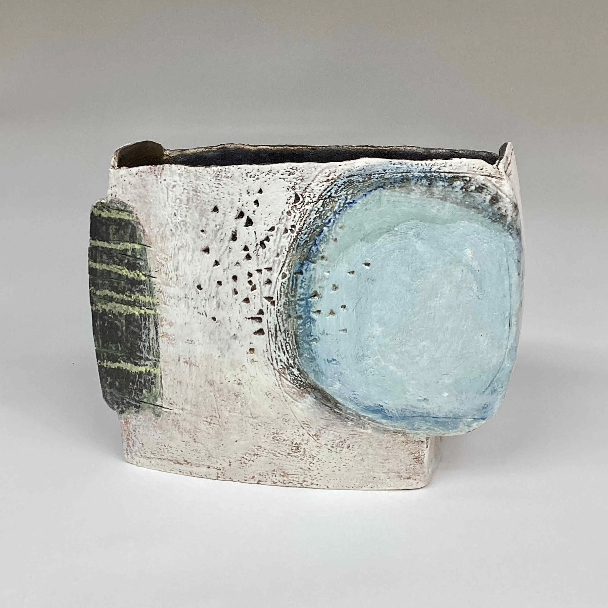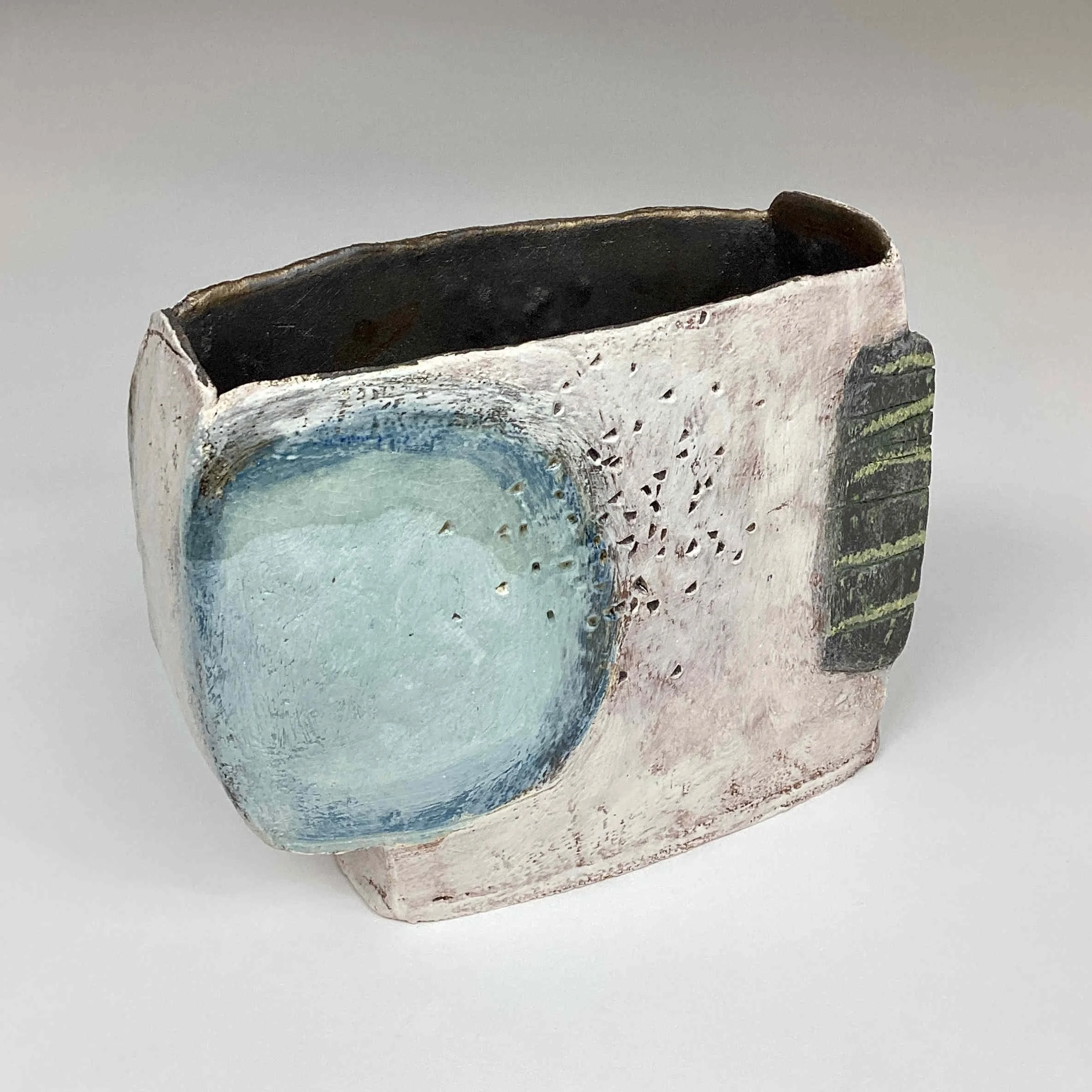 Slab built vessel with incised lines, engobes, underglaze, glaze and oxides. Fired to 1140°C