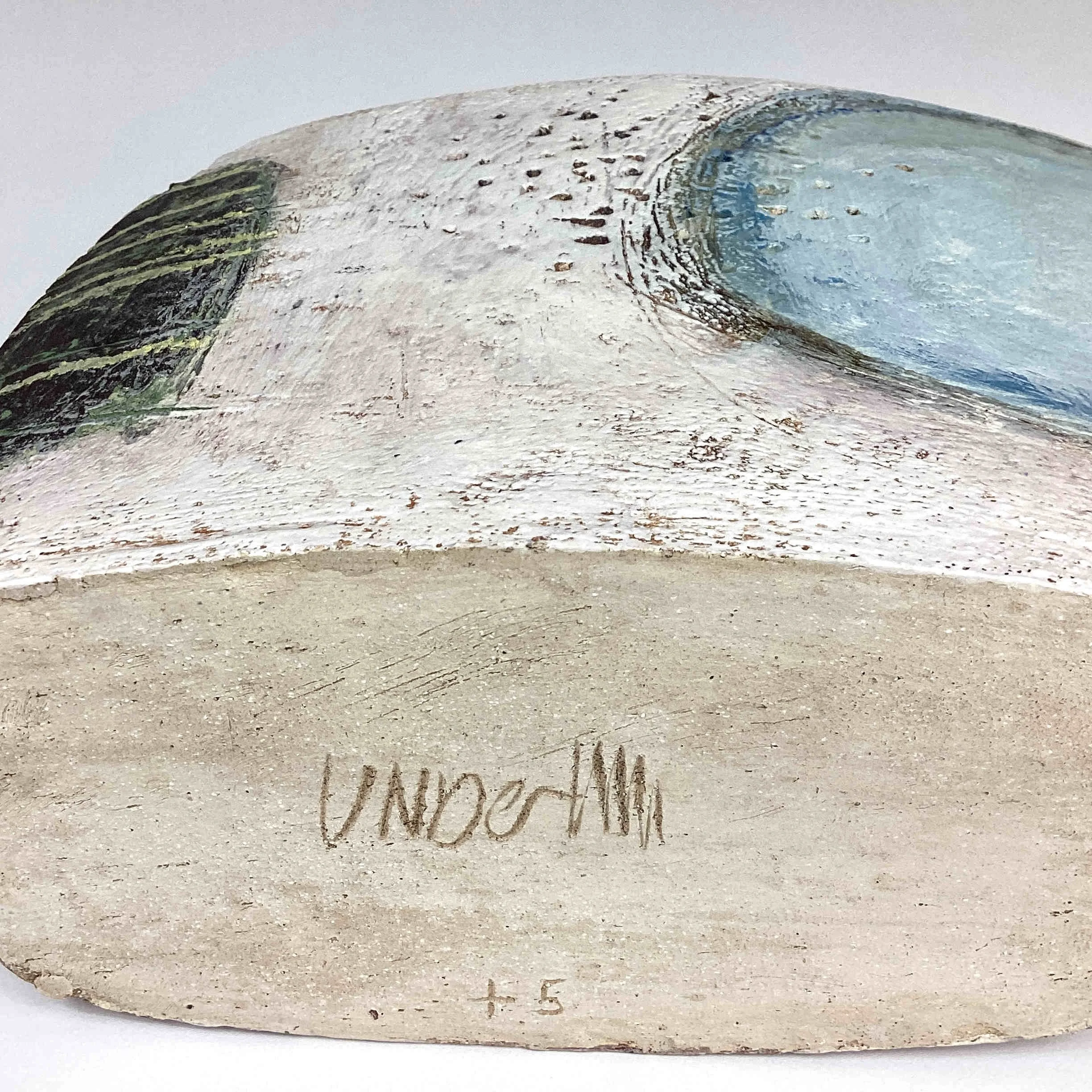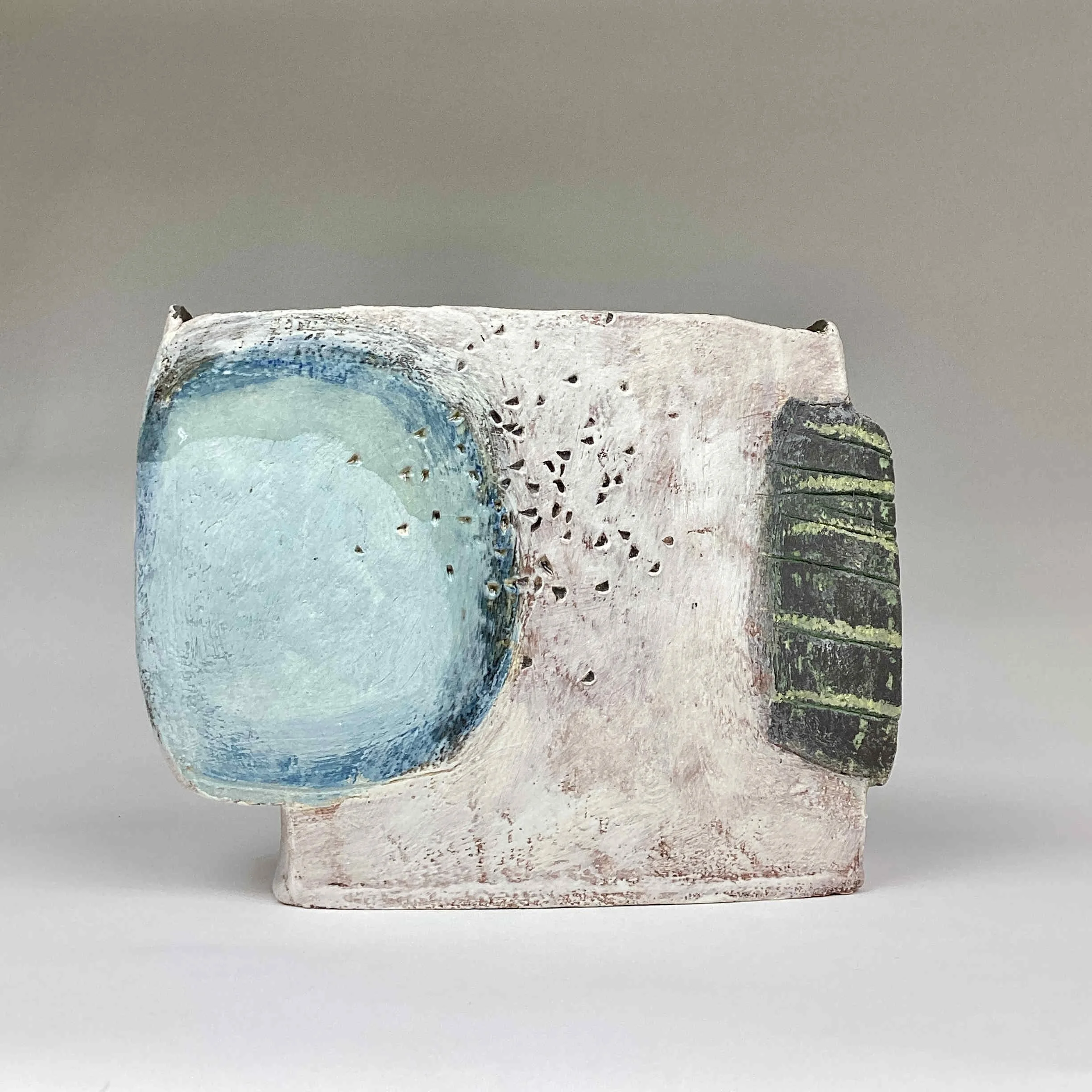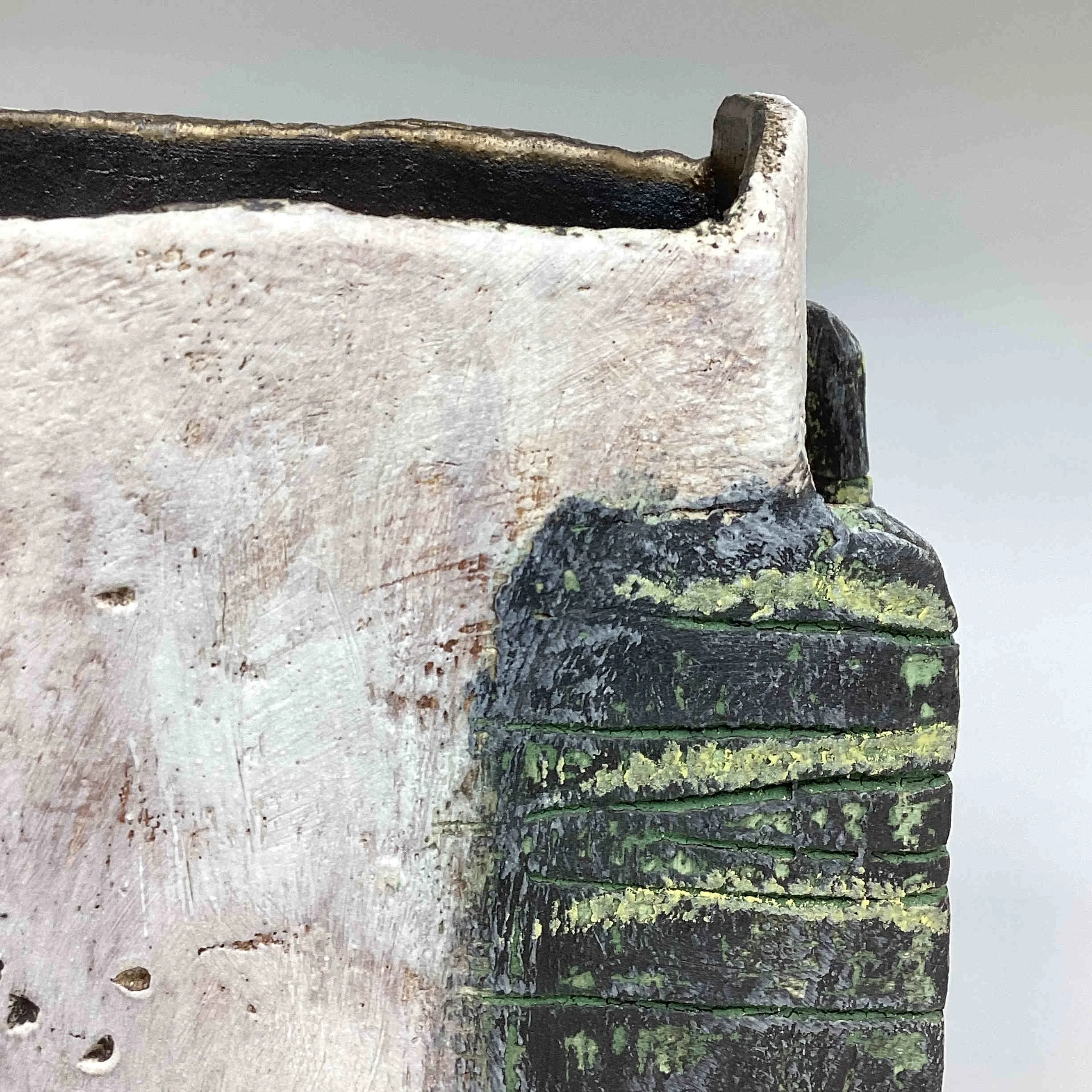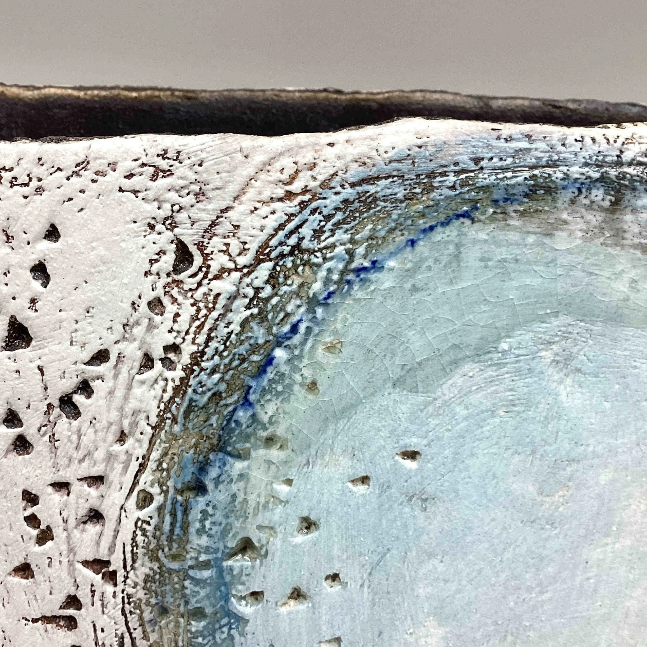 Slab built vessel with incised lines, engobes, underglaze, glaze and oxides. Fired to 1140°C