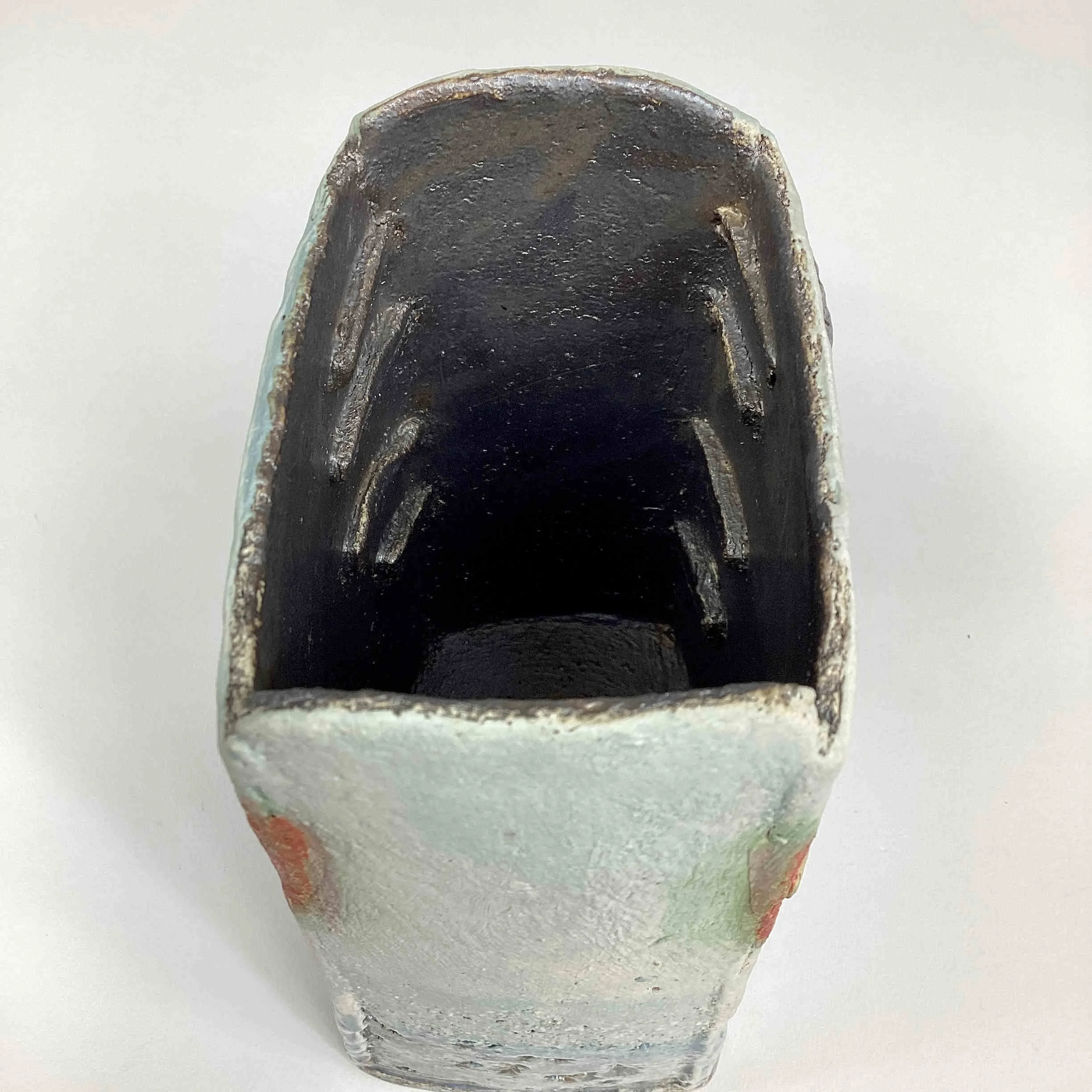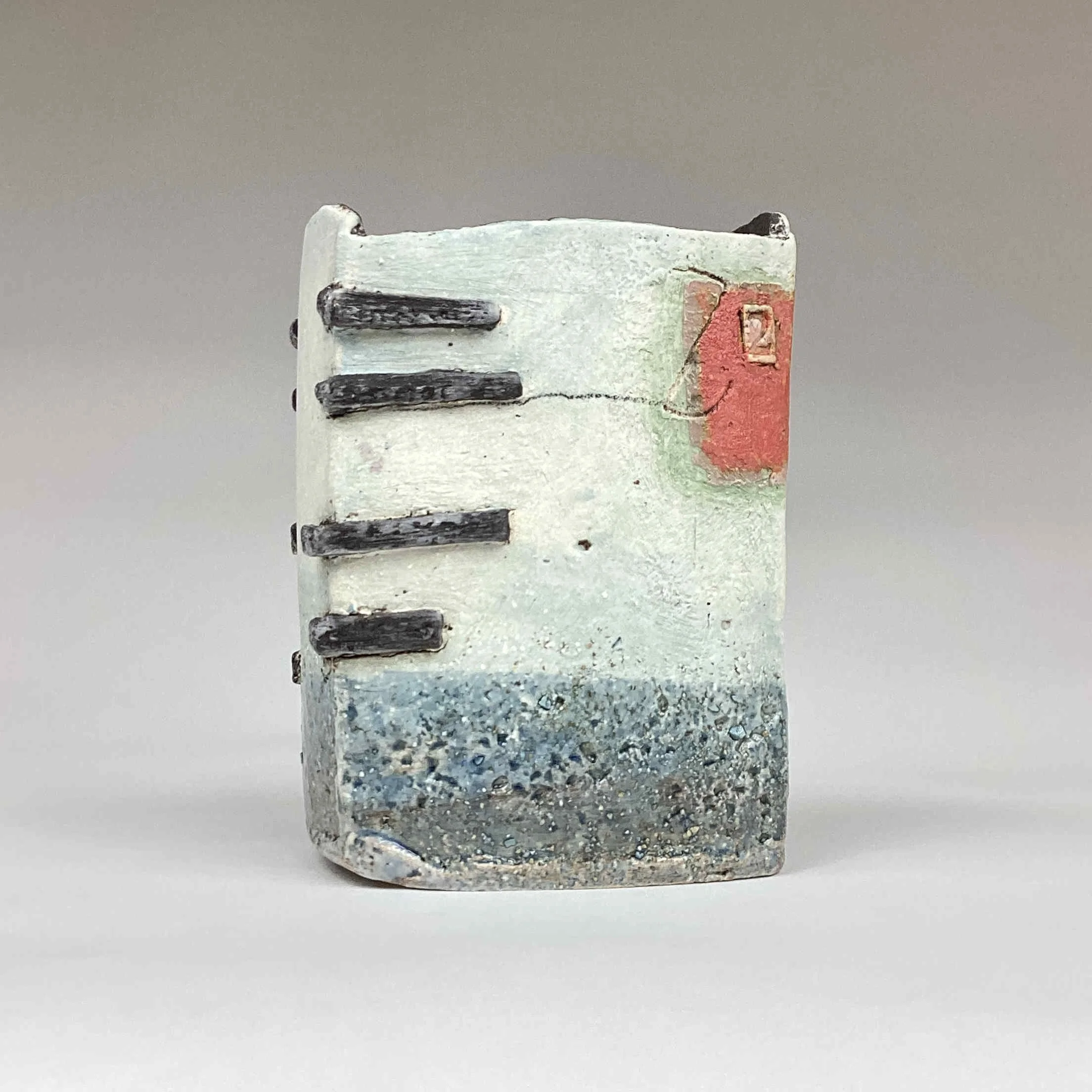 These black pieces are added by cutting a slot into the soft clay and inserting a piece of clay into the gap. This way of doing it takes time but I like that it means they are also visible on the inside of the pot. The bottom section has pieces of coloured grog that I make rolled into the surface and over this is a transparent blue glaze that has a glossy surface that contrasts with the otherwise matt surface. The red mark on the side is a important feature but the subtle green haze around it is equally important as a contrasting colour to the red.