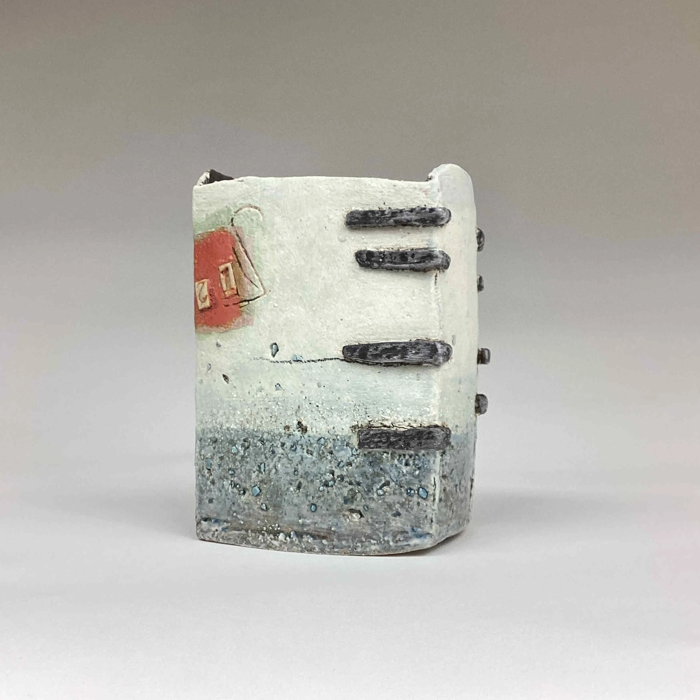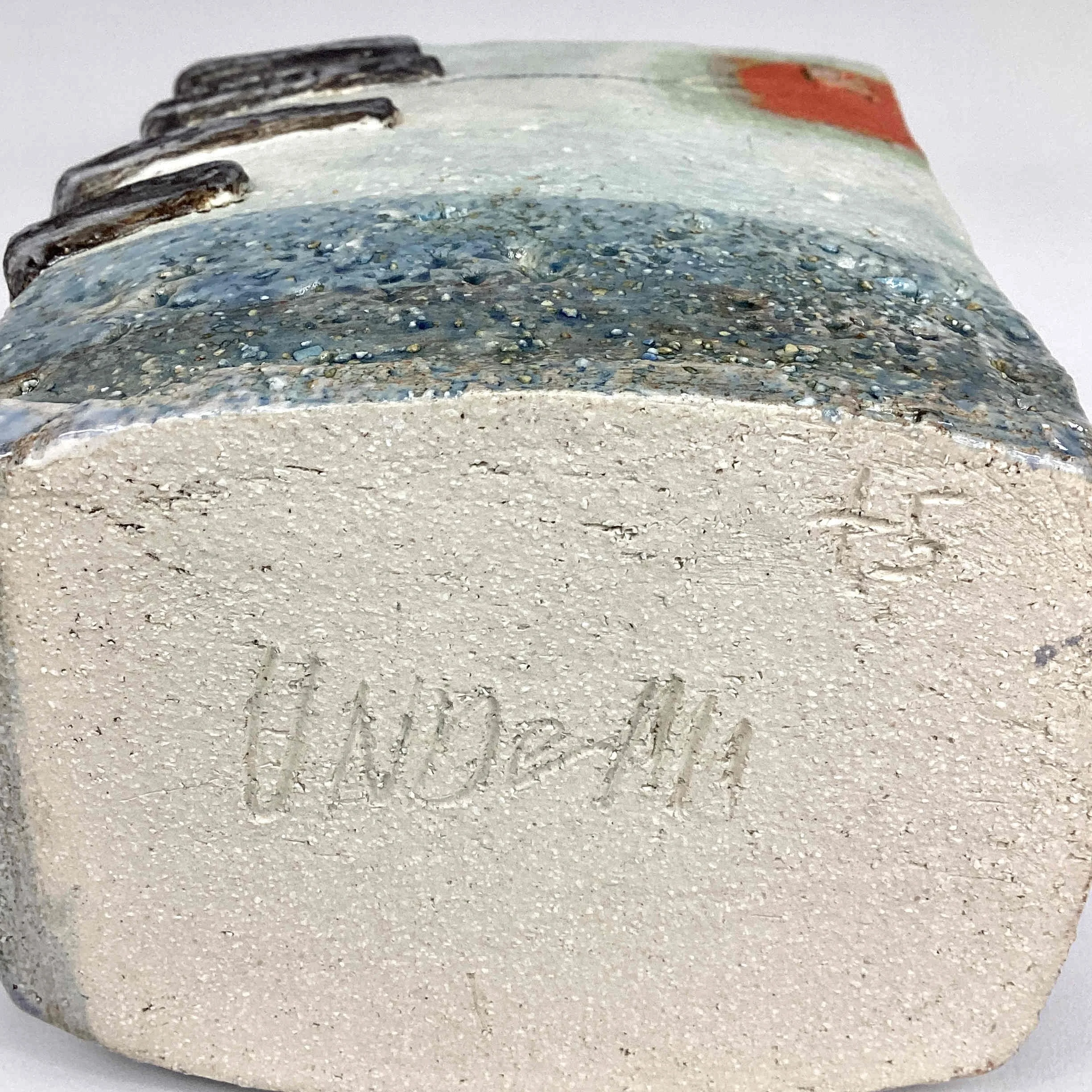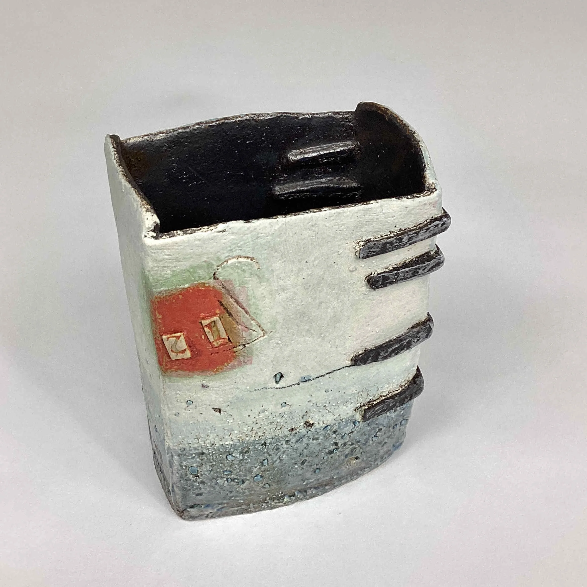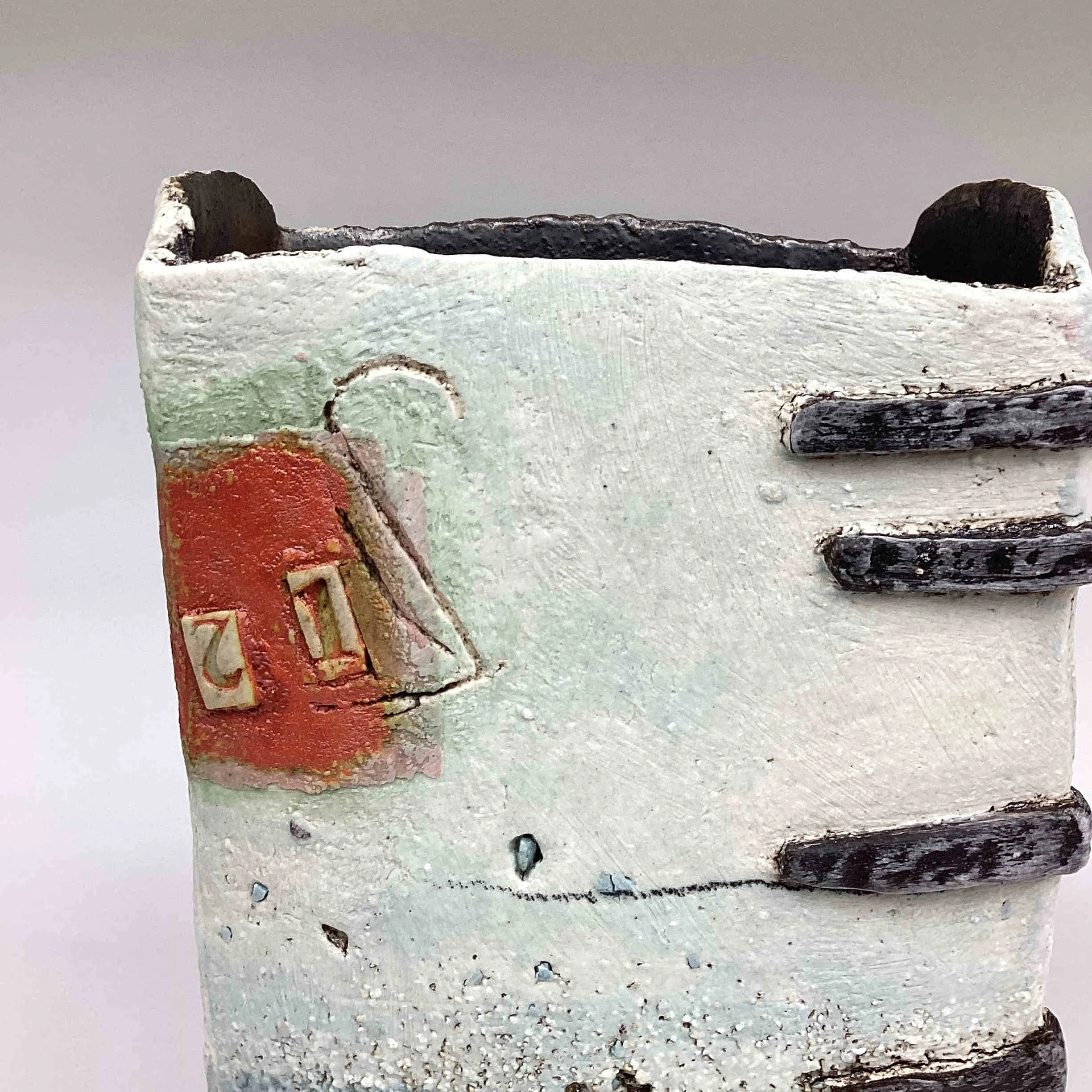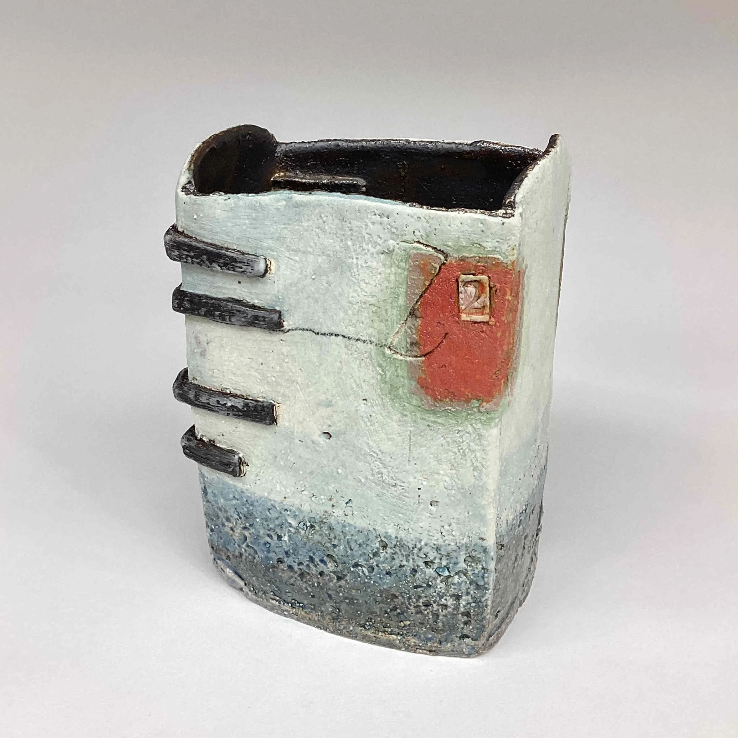 Slab built vessel with incised lines, engobes, underglaze, glaze and oxides. Fired to 1140°C